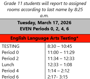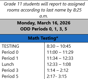 Juniors should report to their assigned testing rooms (see assignments below) by 8:25am each day. Freshmen, Sophomores and Seniors should arrive on campus 5-10 minutes before their first class. of the day: