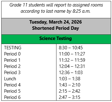 This year, all PVPHS 11th Grade students will be tested. All testing is performed using Chromebooks. Pen High will be on special bell schedules during the testing period in March 16, 17 & 24, 2026 - schedule is posted below.